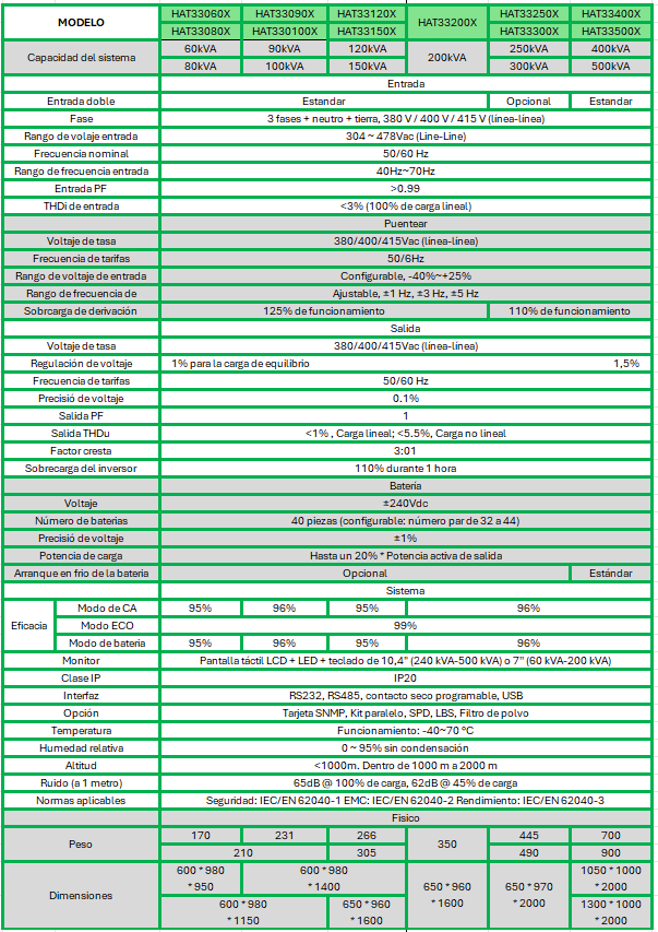 Las características del HAT33X SERIES SAI ONLINE TORRE TRIFÁSICO 60–500kVA son: