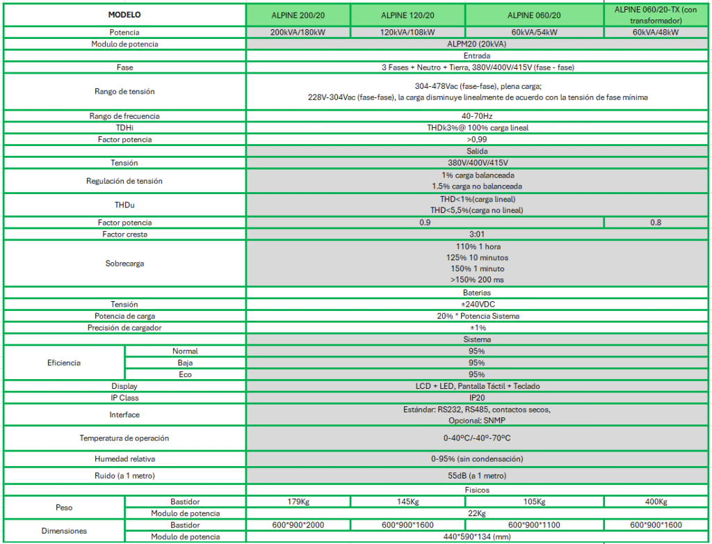Dispone también de versiones con transformador de aislamiento integrado (hasta 60kVA), ideales para entornos que requieren aislamiento galvánico. Con una densidad de potencia de 200kVA en apenas 0,5 m², el ALPINE es una solución altamente compacta y eficiente para data centers, salas técnicas y sistemas de misión crítica.