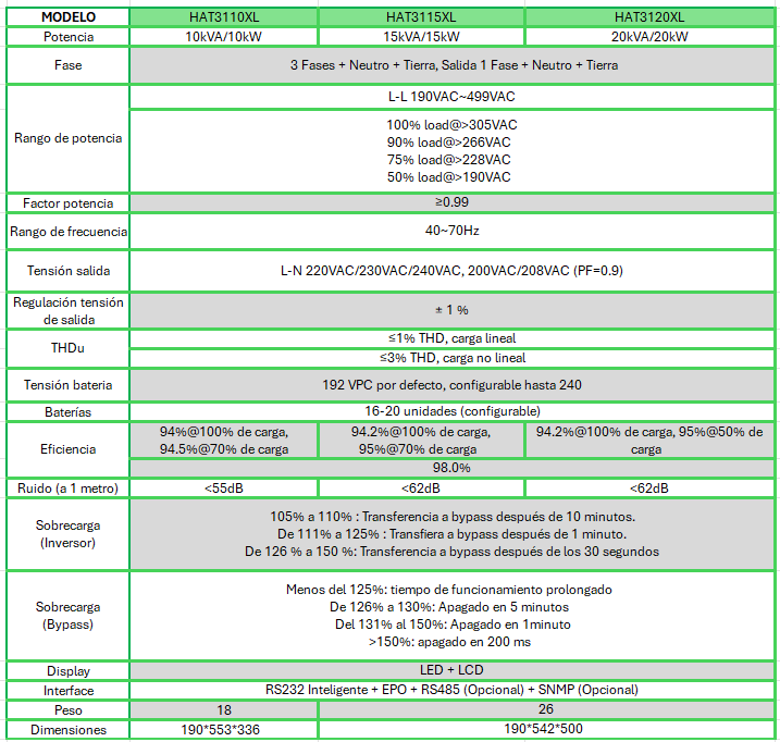 Las características del SAI ONLINE TORRE HAT31X SERIES 10-20kVA son: