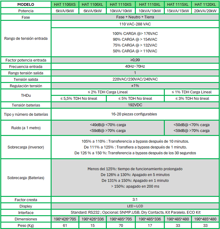 Las características del SAI HAT11X SERIES TORRE ONLINE 6-20kVA son: